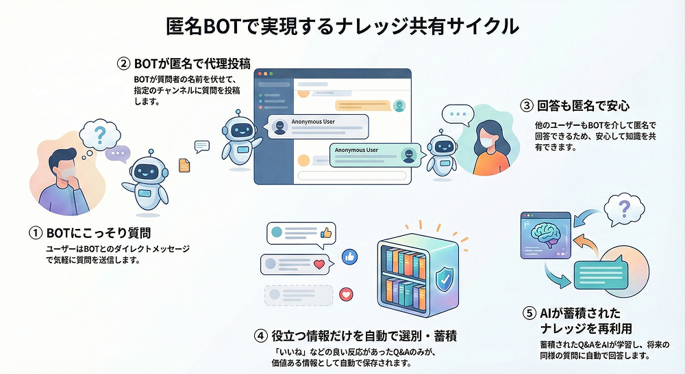 そこで、質問も回答も匿名でできるBOTを作りました。質問はBOTに送るだけ。誰が聞いたかは分かりませんし、答える側も匿名です。気軽にやり取りできるのがポイントです。